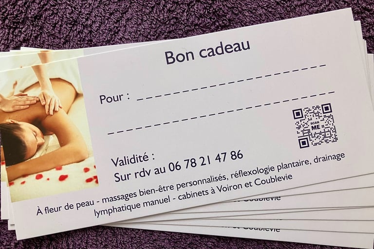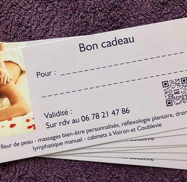 Vous pouvez acheter un bon cadeau pour un massage, pour une durée, ou pour un montant fixe (à partir de 40 euros).